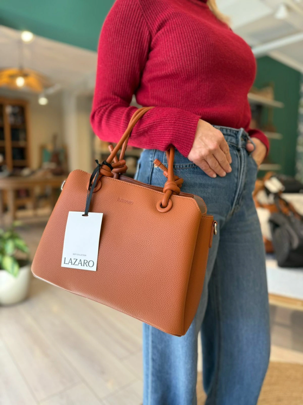 Cartera estructura semi armada confeccionada en PU textura floater combinado con napa en las manijas.