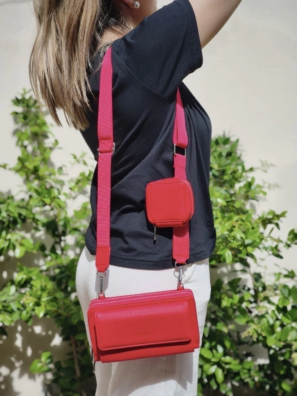 - Cuenta con dos compartimientos con cierre, correa de soga desmontable y regulable, y estuche porta auriculares con cierre