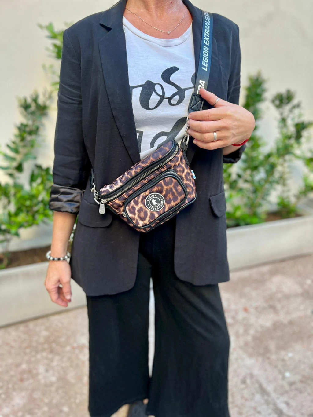 Descubrí la Riñonera Helena, confeccionada en tela estampada en animal print, que combina estilo y funcionalidad. Este modelo cuenta con detalles en simil cuero, cierres y herrajes metálicos que le otorgan un toque sofisticado.